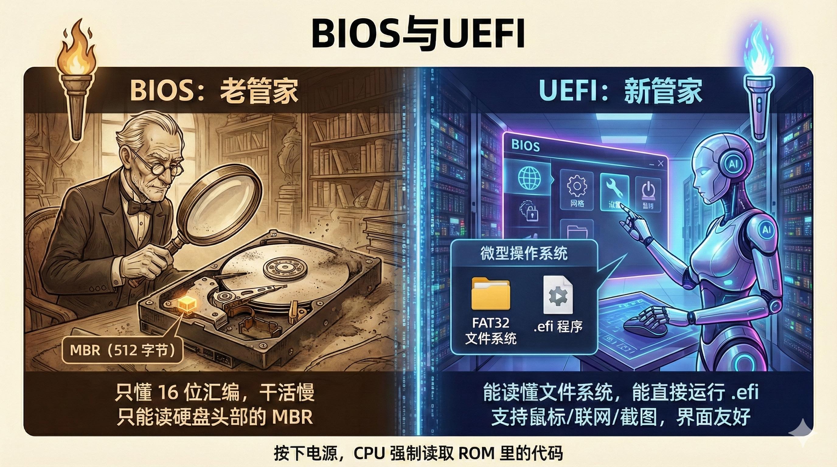 - 新管家叫 UEFI。它本质上已经是一个微型操作系统了。它能读懂文件系统(比如 FAT32),能直接运行后缀为