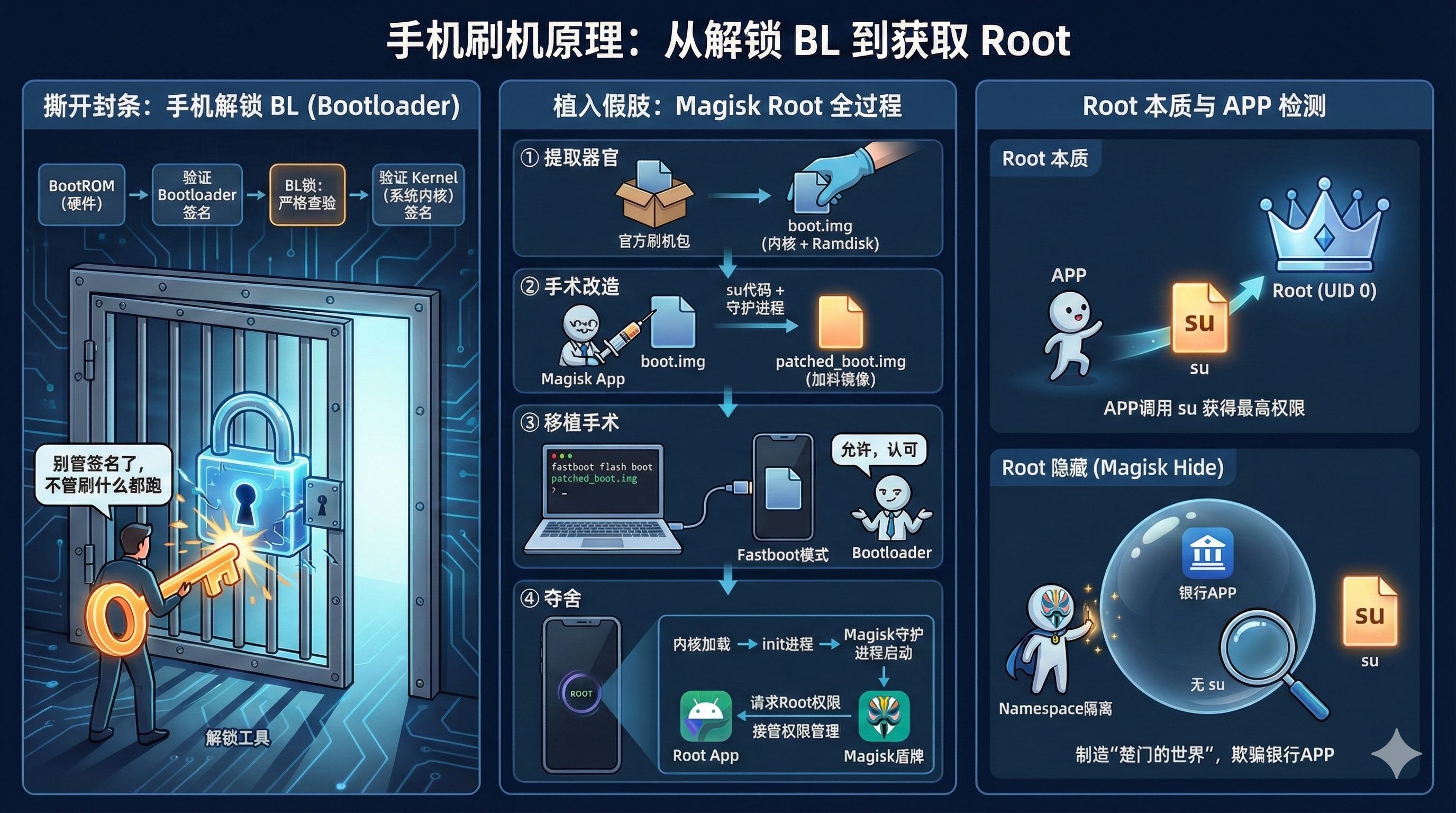 su文件和守护进程)注入 到这个镜像里,而完全不去修改原本的 System 分区。 - 移植手术:因为你之前解锁了 BL,Bootloader 看到这个被篡改过的镜像,虽然签名不对,但它耸耸肩:“反正你解锁了,你开心就好”,然后把它刷进了硬盘。