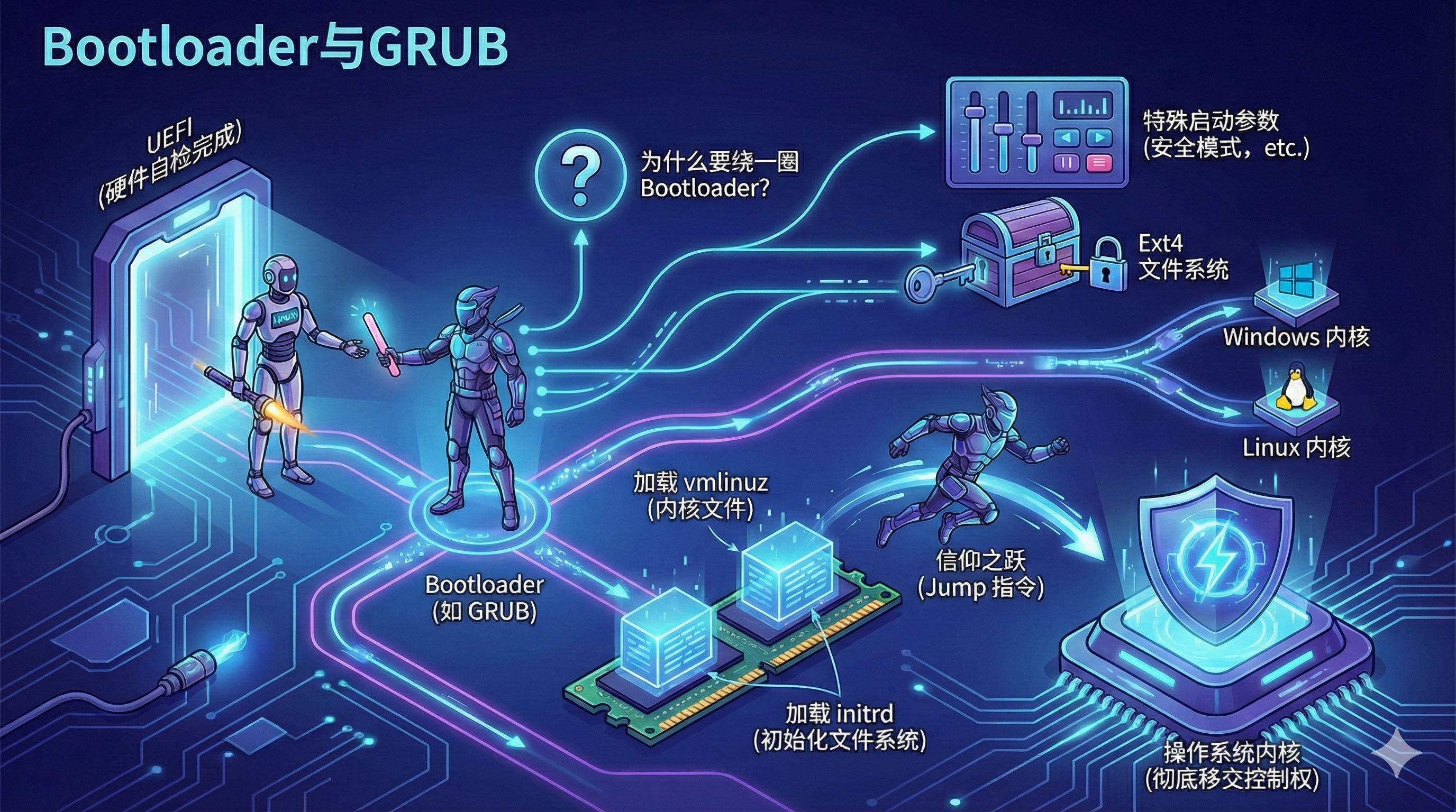 所以,Bootloader 就像是一个专业的“领路人”。它负责把内核文件(vmlinuz)和初始化文件系统(initrd)搬运到内存里,一切准备就绪后,执行一个信仰之跃(Jump 指令),将 CPU 的控制权彻底移交给内核。