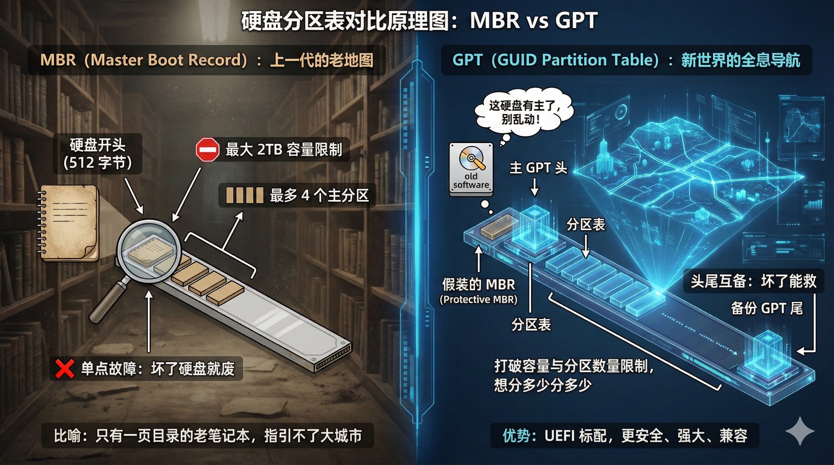 - 地图 (MBR 与 GPT):决定了地盘怎么分。