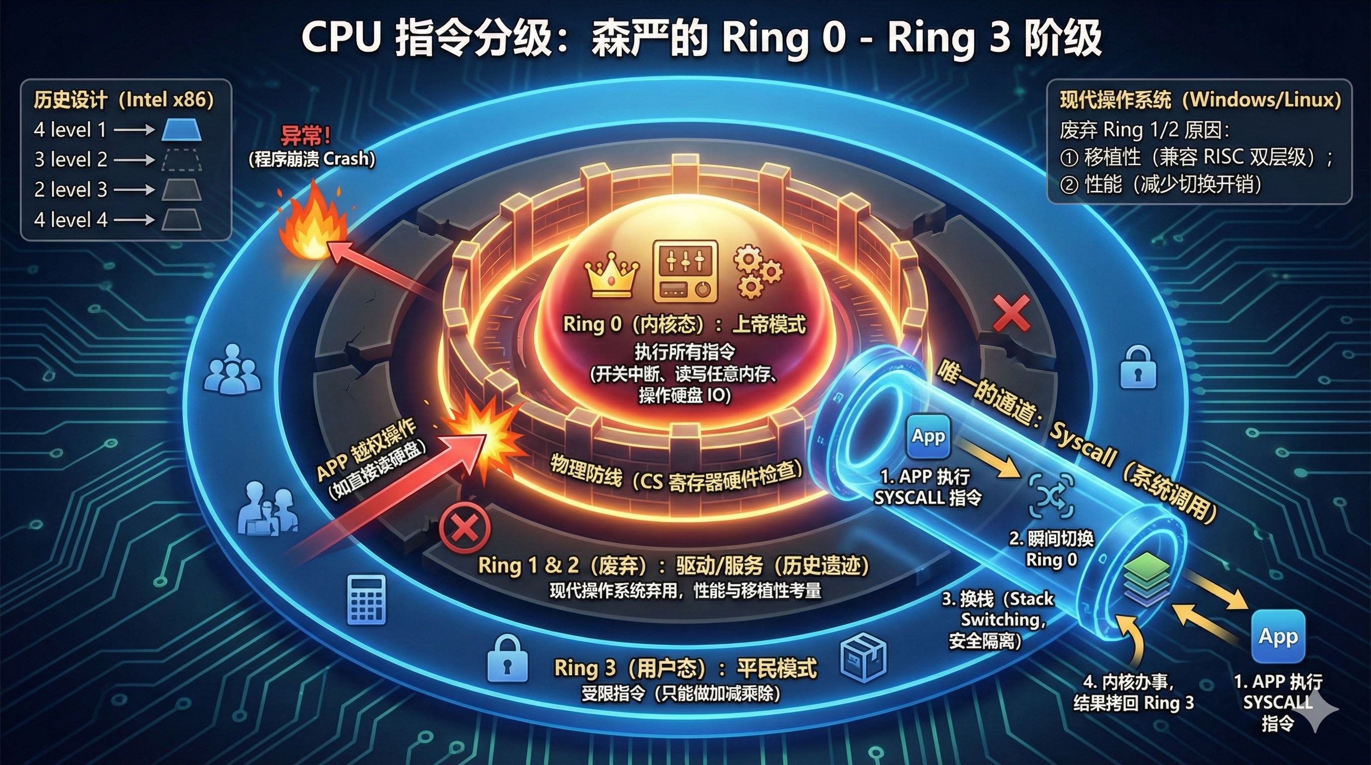 Intel x86 架构在设计之初,其实定义了 4 个特权级:Ring 0(内核,最高权限)、Ring 1 & 2(原本给驱动)、Ring 3(应用程序,最低权限)。