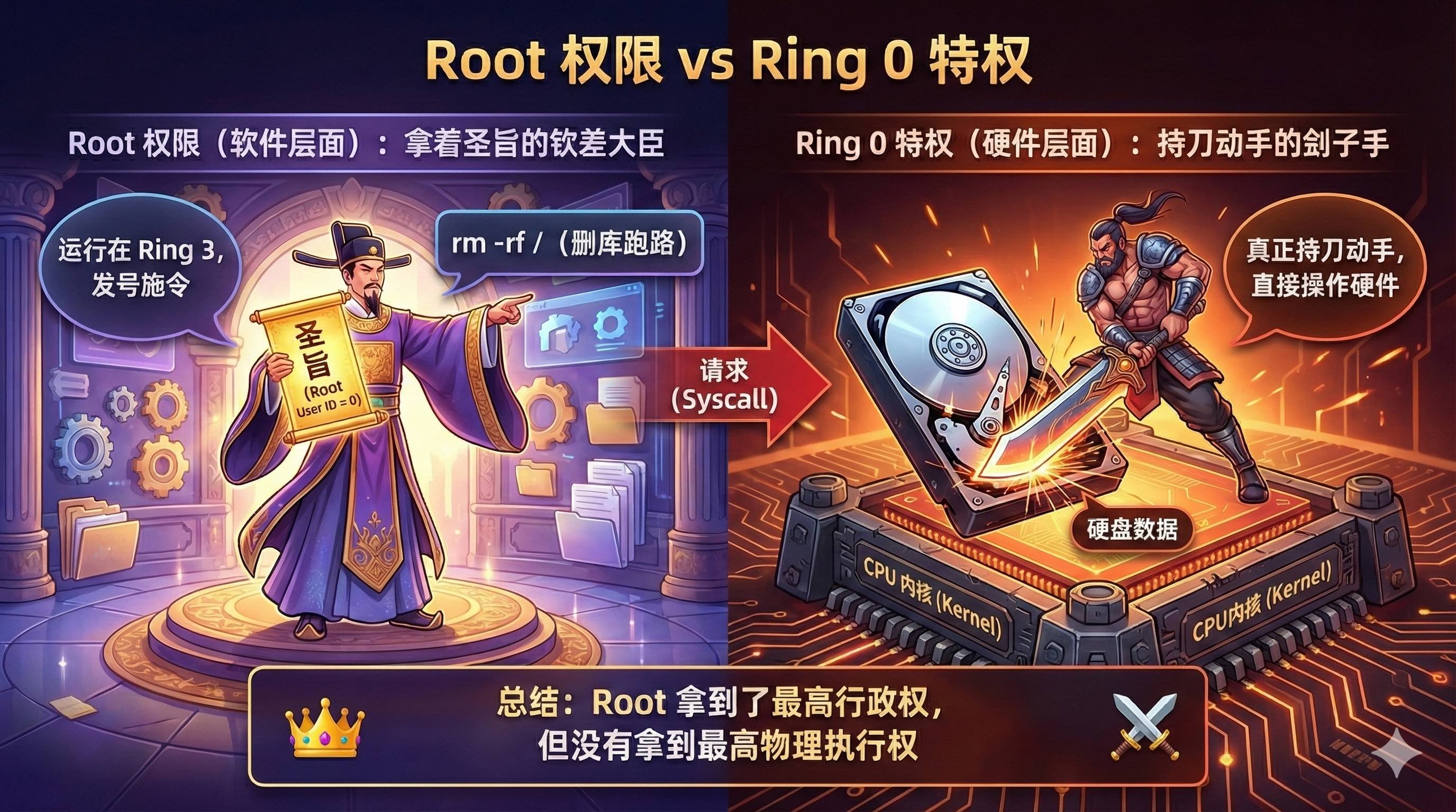 总结一下:Root 用户就像是拿着“圣旨”的钦差大臣,但他本身还是个人(运行在 Ring 3);而 Ring 0 才是那个真正持刀动手的刽子手。Root 拿到了最高行政权,但没有拿到最高物理执行权。