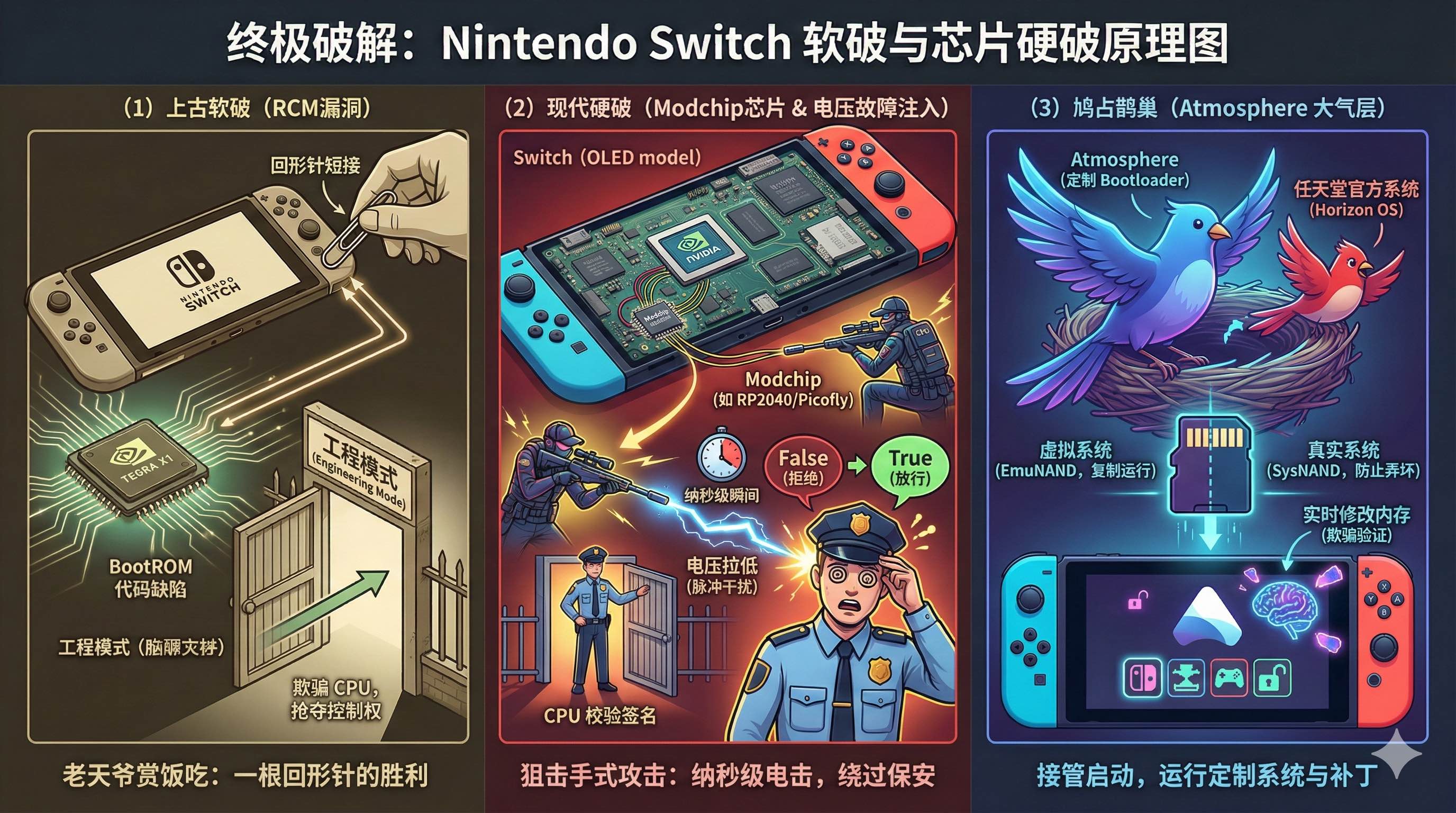 如果说手机 Root 还是软件层面的博弈,那么 Switch 的破解就是物理层面的暴力美学。Switch 破解的核心动力非常朴素:因为穷,不想买游戏,所以必须绕过游戏签名验证。